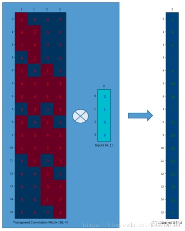 假设我们转置这个卷积矩阵C ( 4 × 16 ) C \ \ (4 \times 16)C (4×16)变为C T ( 16 × 4 ) C^T \ \ (16 \times 4)C T (16×4)。我们可以对C T C_TC T 和列向量( 4 × 1 ) (4 \times 1)(4×1)进行矩阵乘法,从而生成一个16 × 1 16 \times 116×1的输出矩阵。这个转置矩阵正是将一个元素映射到了9个元素。