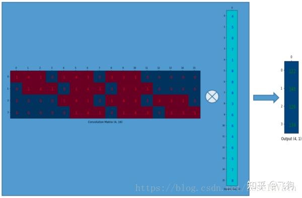 我们可以将这个4 × 16 4 \times 164×16的卷积矩阵和1 × 16 1 \times 161×16的输入列向量进行矩阵乘法,这样我们就得到了输出列向量。