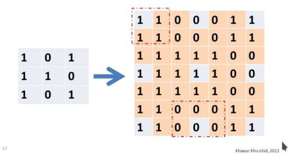 我们想要将输入矩阵中的一个值映射到输出矩阵的9个值,这将是一个一对多(one-to-many)的映射关系。这个就像是卷积操作的反操作,其核心观点就是用转置卷积。举个例子,我们对一个2 × 2 的矩阵进行上采样为4 × 4 的矩阵。这个操作将会维护一个1对应9的映射关系。
