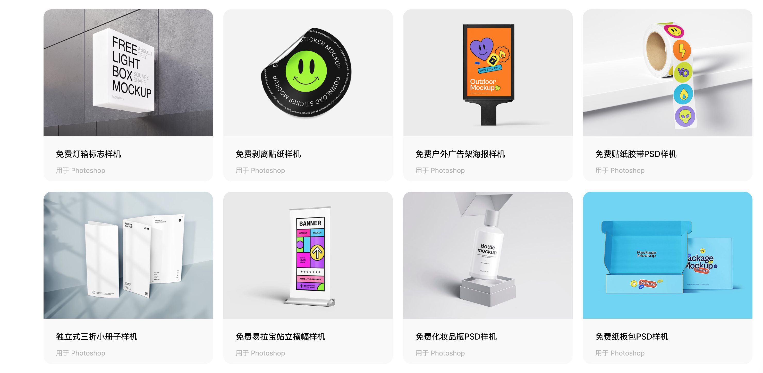 这里的样机Mockups有设备(主要是手机)、服装服饰、包装、站牌、广告牌、名片、木制品、瓶子、产品、饮料、纸制品、杂志等。
