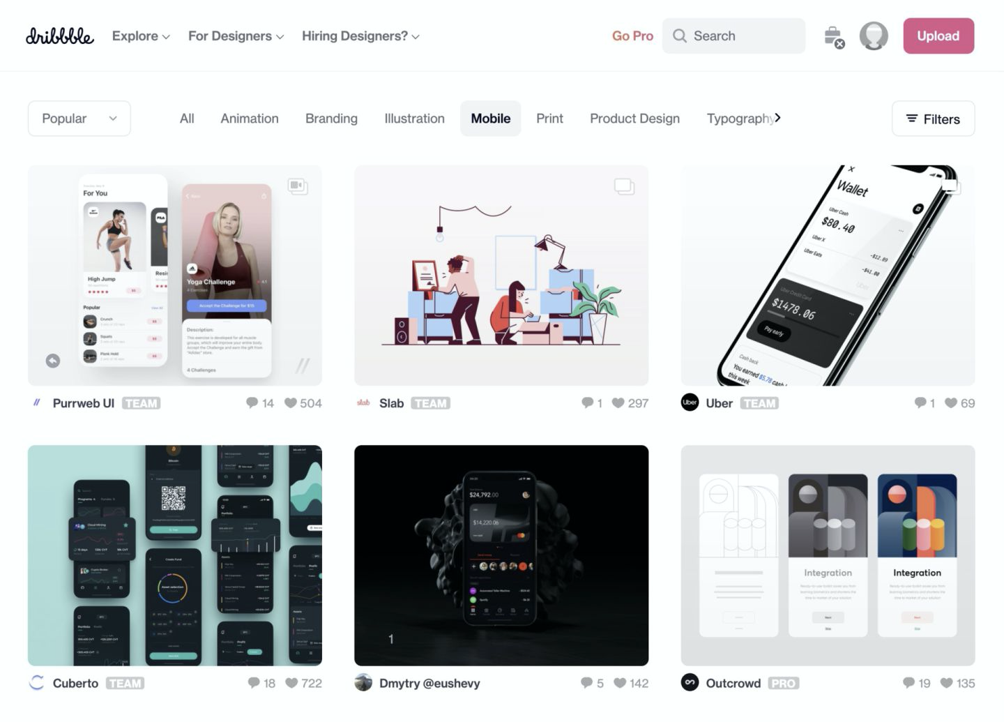 Dribbble 是⼀个著名设计师作品分 享平台,全球设计大神云集,在网站上搜索英文关键词便可看到相关作品,包括品牌设计、手绘插画、动效、排版、网页和移动端UI设计。