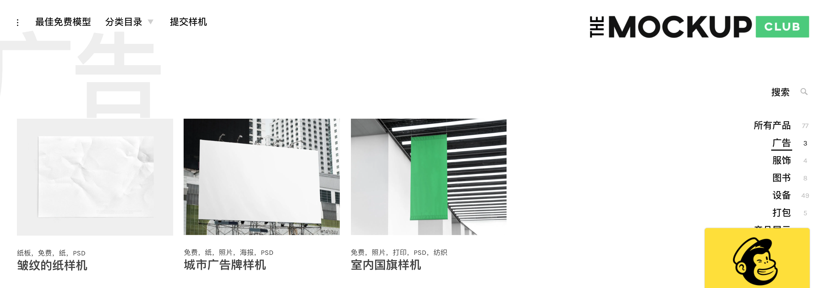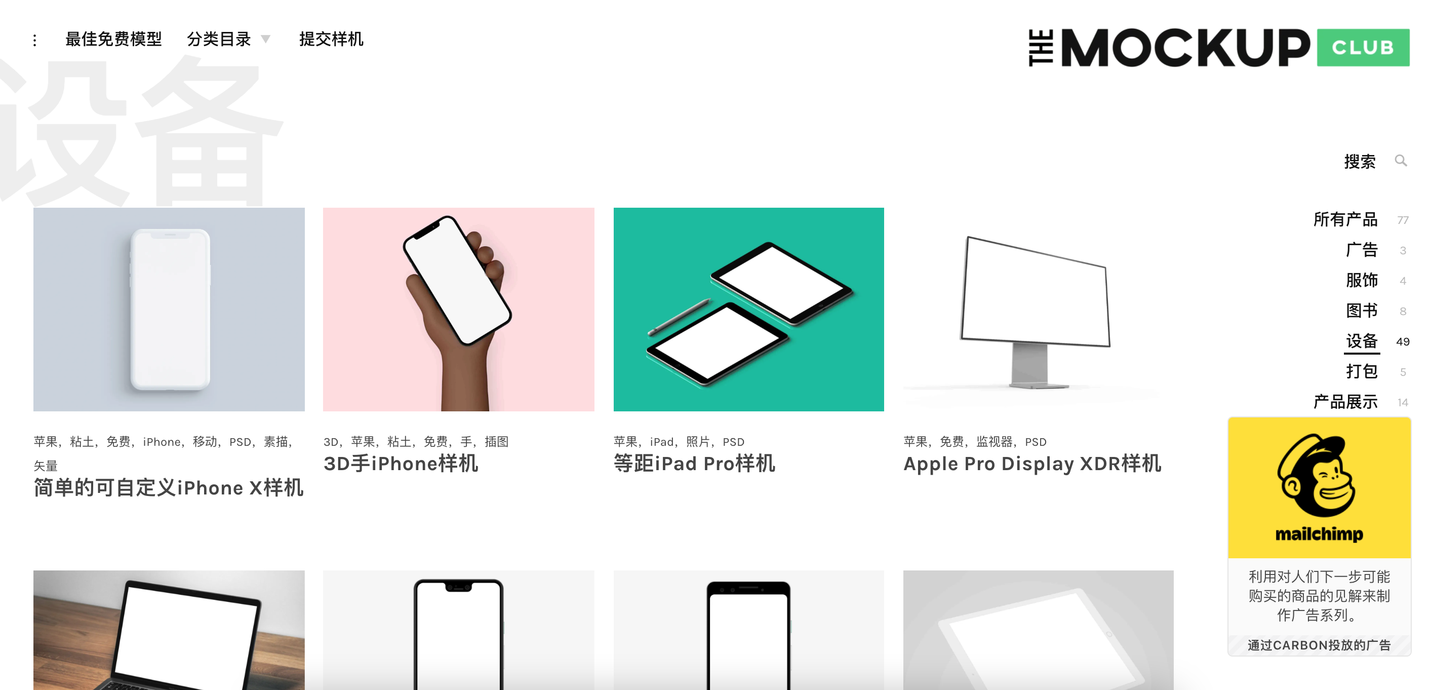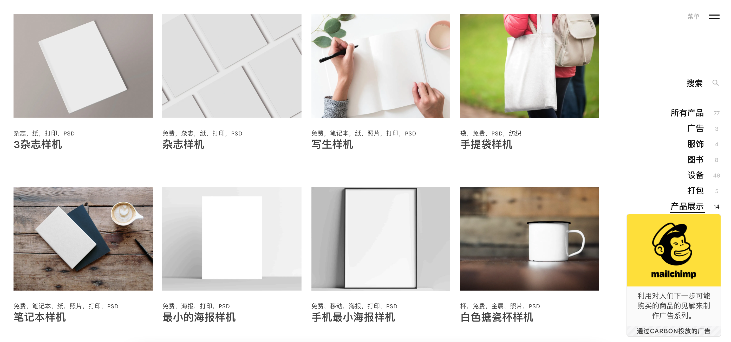 全品类免费样机网站,风格偏简约大方,应有尽有,支持Ps、Sketch。