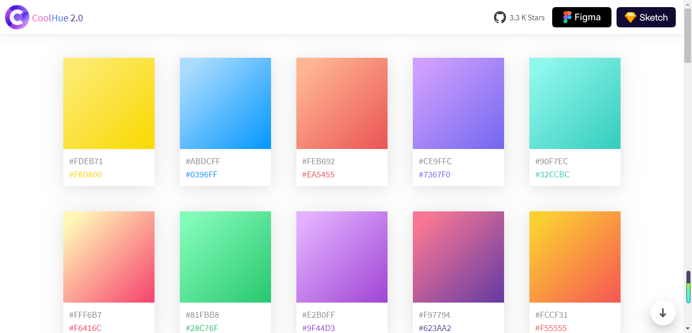 富有超多好看渐变渐变配色的网站,只需要复制色彩编号填充渐变,或者直接下载PSD,Sketch,图片,CSS代码。