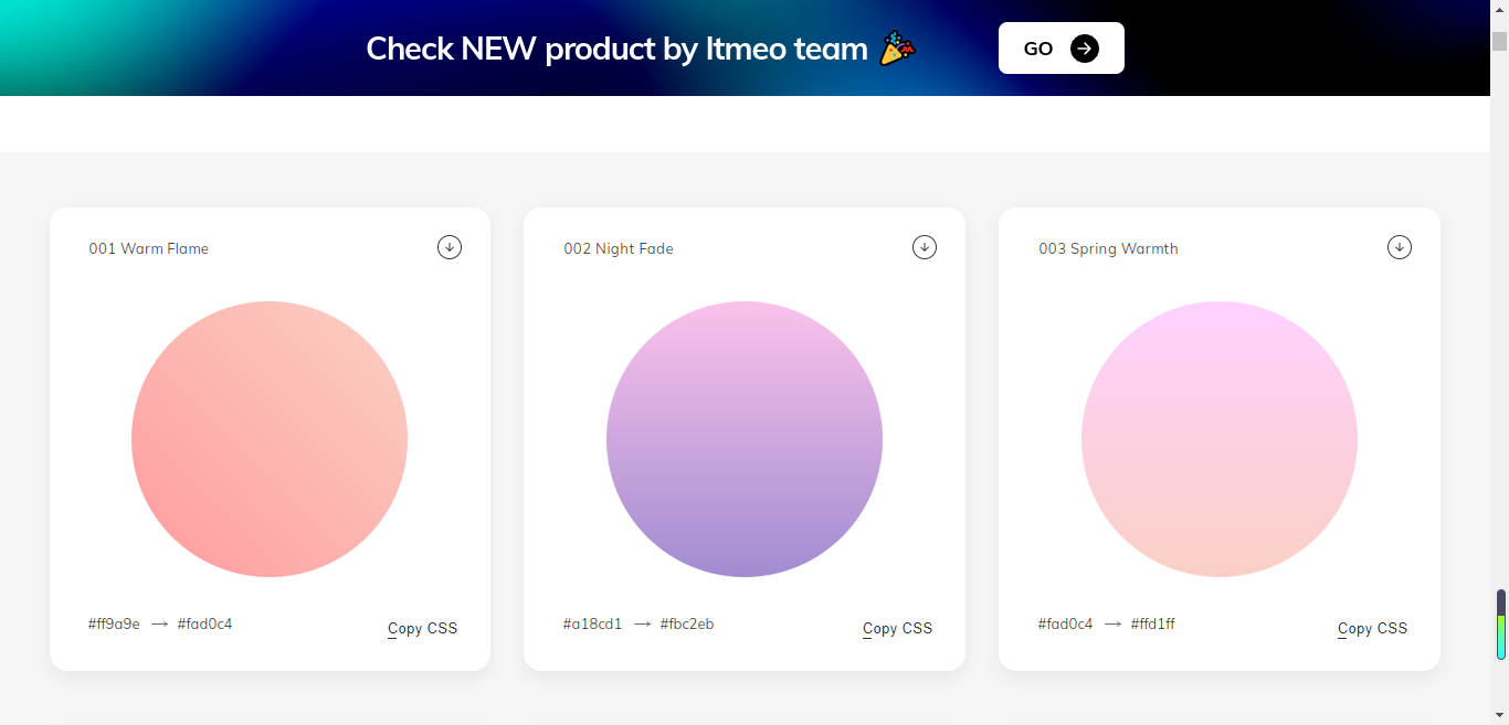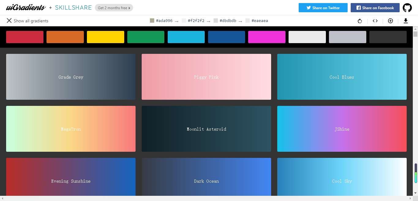 UIgradients 以分享美丽渐变色彩为主的分享站,里面接近上百种渐变配色方案,设计师可根据自己风格来选择搭配,此外我们还能直接获得对应渐变配色的CSS代码。
