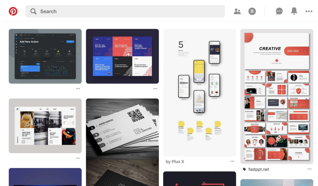 是⼀个著名设计师作品分 享平台,全球设计大神云集,在网站上搜索英文关键词便可看到相关作 品,包括品牌设计、手绘插画、动效、排版、网页和移动端UI设计。 pintrrest 是世界上最大的图片社交分享网站,用户可以创建和管理主题图片集合,在这里可以看到海量的优秀设计作品,你在查看⼀个作品时能够为你推荐更多优秀的同类作品。