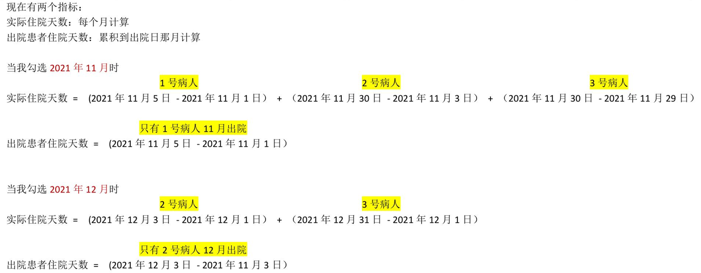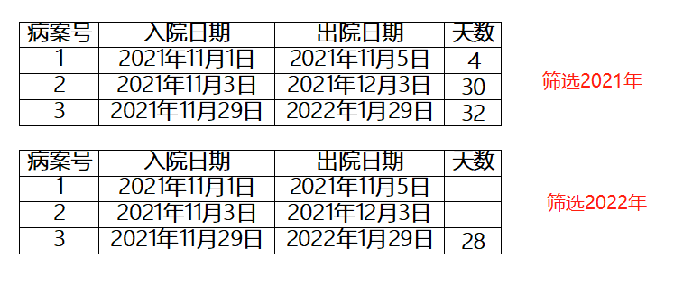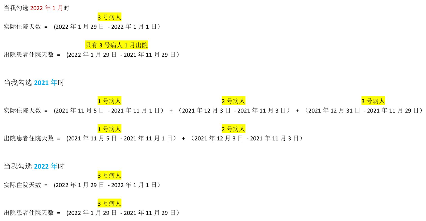 根据网友提问,当网友筛选2021年时,病人1号和2号是出院日期-入院日期,3号是2021/12/31-入院日期。当筛选2022年时,因为病人1号和2号在2021年就出院了,所以只有3号,他的计算方法是出院日期-2022/1/1