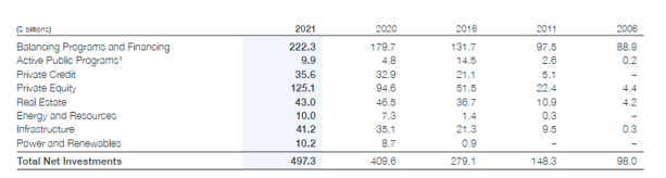 其中, 直接私募股权团队 专注于 对北美和欧洲的私人公司进行直接的股权投资,从被动的少数股权投资到100%的控制权,投资于除房地产以外的所有行业, 重点是与各种类型的合作伙伴一起进行大规模投资,最小投资规模通常为1.5亿加元,没有预先确定的最大投资规模限制,该团队共有60多名全职员工,在多伦多、伦敦、旧金山和纽约设有办公室。根据年报披露的数据,2021财年,该团队共进行了88笔直接股权投资,价值533亿加元,相比之下,2020财年该团队共进行了85笔投资,价值380亿加元。