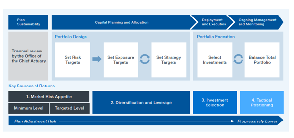 鉴于这些变量, CPPIB定义了几个关键的回报风险因素,包括:经济增长、政府债券收益率、公开交易房地产的回报、政府债券收益的信贷利差、公司规模等。 这些因素彼此相对独立,但构成了许多类型投资回报的基础。CPPIB根据所选因素集对投资策略的影响程度对投资策略进行建模和映射,然后在整个投资组合框架中始终使用这些因素集。例如,当构建投资组合时,CPPIB确定每个因素对及货币、杠杆和流动性的目标敞口。CPPIB还认识到主动管理的额外预期风险和回报。鉴于这些特征,CPPIB可以分析重大新投资或撤资可能如何影响总投资组合的风险敞口。随着市场和证券价格的变化,CPPIB重新平衡自己的投资组合,并寻求避免意外因素和风险敞口。