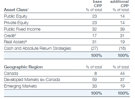 在确定市场风险目标的基础上,CPPIB设定了风险敞口目标即战略投资组合, 投资组合代表着其为基础CPP和额外CPP管理的净资产。 在构建投资组合时,为了使投资组合多样化, CPPIB增加了收入来源更稳定的资产类别, 如信贷、房地产、基础设施和其他实物资产。但这些资产的市场风险和相应回报水平通常低于参考投资组合中的公共股票, 为了平衡这些低风险资产的纳入,CPPIB同时兼顾了更广泛的高风险和高回报战略, 如:减少对上市公司股票的投资,增加对私营公司的股权的配置;在公共和私人债务中部分用高收益信贷替代政府债券;利用债务为房地产和基础设施投资提供资金;增加对选定新兴市场的参与;以及利用多空投资策略,通过投资选择增加价值等。 这些战略敞口转换被为基础CPP和额外CPP投资组合的六种不同公共和私人资产类别的权重。这些战略投资组合代表五年及以后的指示性资产配置,CPPIB至少每三年审查一次关键回报风险因素敞口和杠杆的战略组合,以满足其长期目标。 当前战略投资组合的资产类别和地理位置分布情况如下(详见图四)。