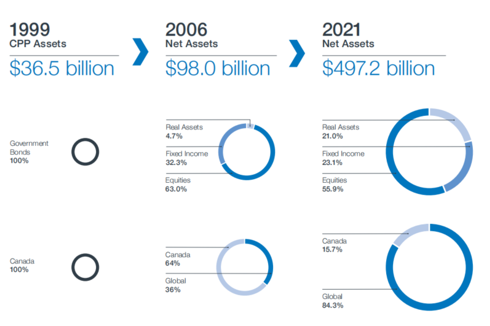 图五:CPPIB的资产管理规模和配置比例变化(1999-2021)
