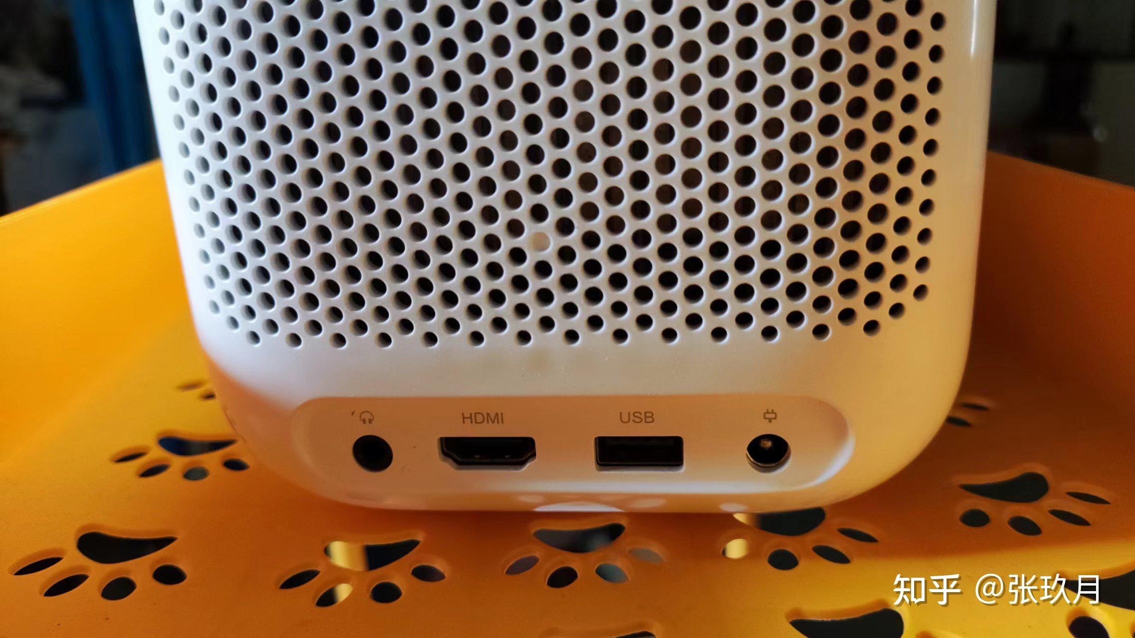 扬声器位于投影仪的正下方,背面则是接口,包括耳机/音响接口、HDMI 2.0接口、USB接口和电源接口。