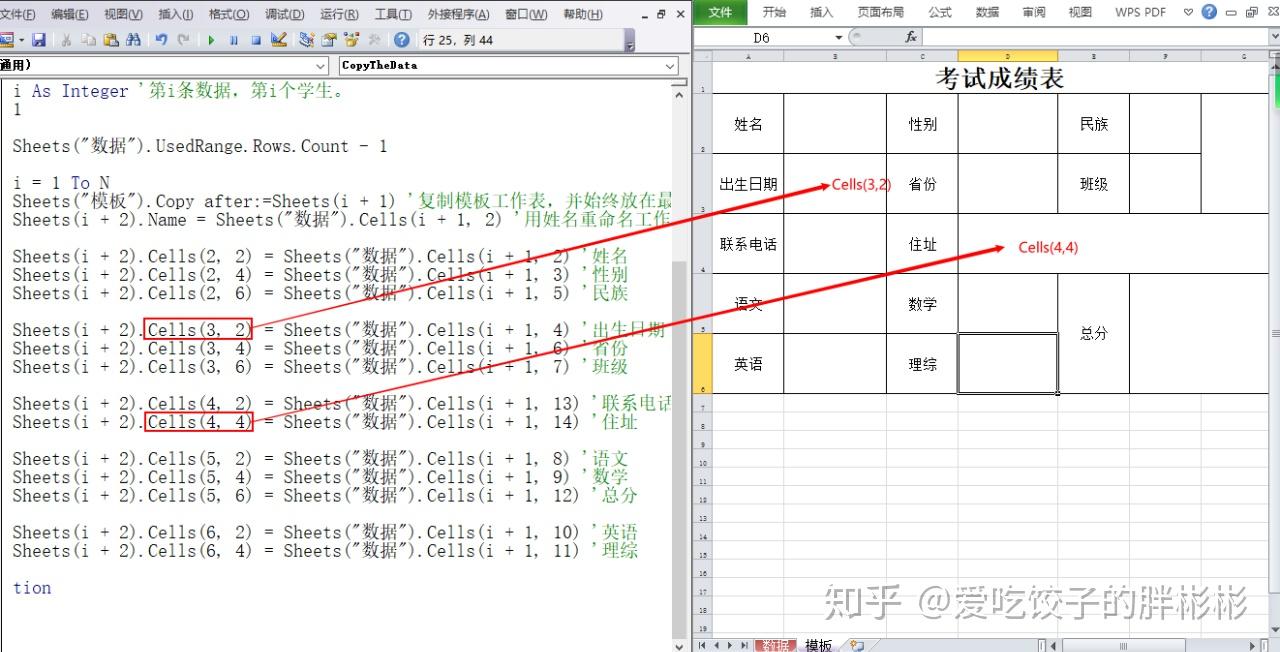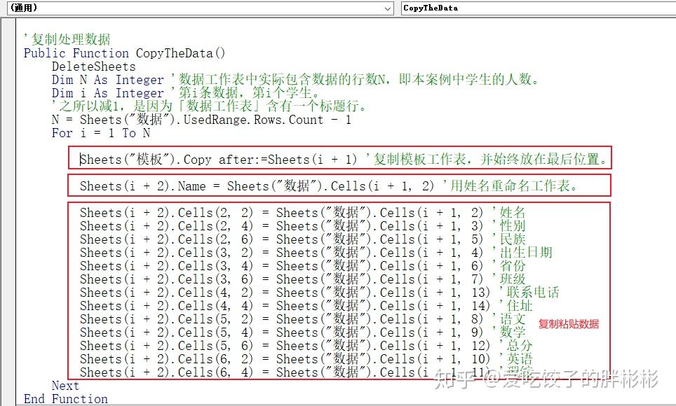 意思就是把名称为「 数据 」的工作表中行索引为j,列索引为z的单元格的内容赋值给第i个「 工作表 」中行索引为x,列索引为y的单元格。 在本案例中就是把 「 数据工作表 」 中每个学生的每一项信息复制到新添加的 「 模板工作表 」 中。