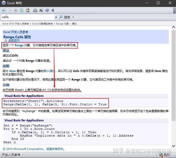 代码中有这样一句「 Sheets(i + 2).Name = Sheets("数据").Cells(i + 1, 2) 」需要重点理解。其中「 Cells属性」 非常重要,是什么意思呢?一起来看一下Excel帮助文档关于「 Cells属性 」的解释吧,就是代表工作表中的一个单元格。