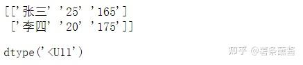那么上面的np.array([['张三',25,165],['李四',20,175]])可以进行修改。