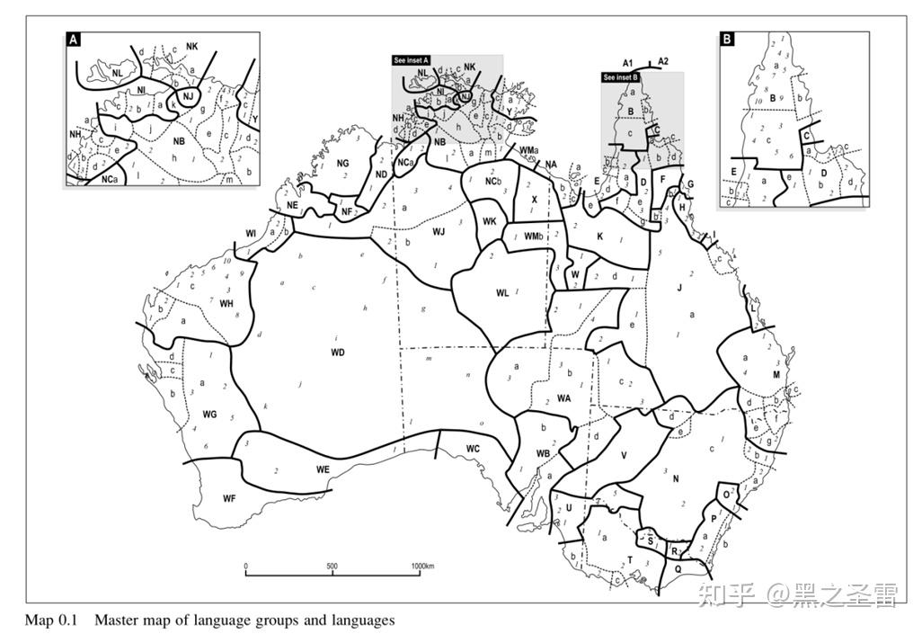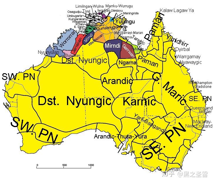 然而随着对澳洲了解的深入,我才逐渐意识到,在这样一片极度贫瘠且气候无端的大陆上,发展出了采集狩猎社会可以达到的极致,PN语系的扩张还是个相对次要的事情,全澳洲大陆范围内无论语系的 持续长距离接触 才是最令人叹为观止的地方。但很可惜的是,这一事实的知名度实在太低了,谈起语言接触时最津津乐道的必然是阿尔泰语 盟 (许多地方仍然延续着旧的 所谓 “阿尔泰语系”之名)——澳大利亚在国际上的知名度算是相当高的了,但澳洲原住民语言的知名度却极其低,低到对于其使用者长什么样都普遍缺乏概念。