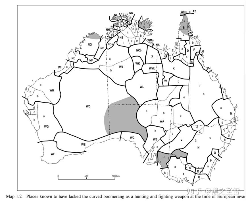 这种交融与扩散在各方面都有佐证,比如澳洲经典工具——回旋镖。(作为武器而非仅仪式使用的)回旋镖均匀地扩散到了大陆各处,大体上只有一些边缘地区没有(图中灰色)。而且这一扩散在殖民者到来后还在继续,比如沃罗兰语系(Worrorran,在西北的金伯利)使用者就从西沙沙漠居民处学会了回旋镖。