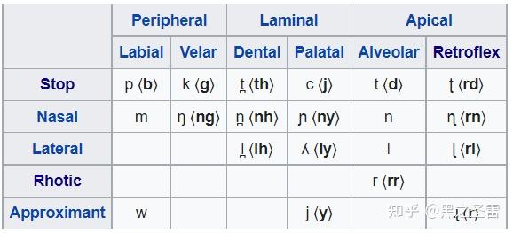 - 部位对立异常丰富 ,通常按主动发音器官分为舌尖组(龈、卷舌 [10] )、舌叶组(齿、硬腭)、边缘组(双唇、软腭)。所有语言都有边缘组爆音和鼻音、以及/w/,而舌冠组(舌尖+舌叶)会变动。不过,由于发音部位的区分过于详细,导致说话者会 禁止部位同化 发生(如不同部位的鼻音和爆音构成辅音簇时,部位不会同化)。