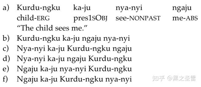 通常是非构型(non-configurational)语言,这一概念最早也正是在研究澳洲语言时提出的,因为这些语言的语序似乎极端自由,对之前的生成句法理论产生了重大挑战。