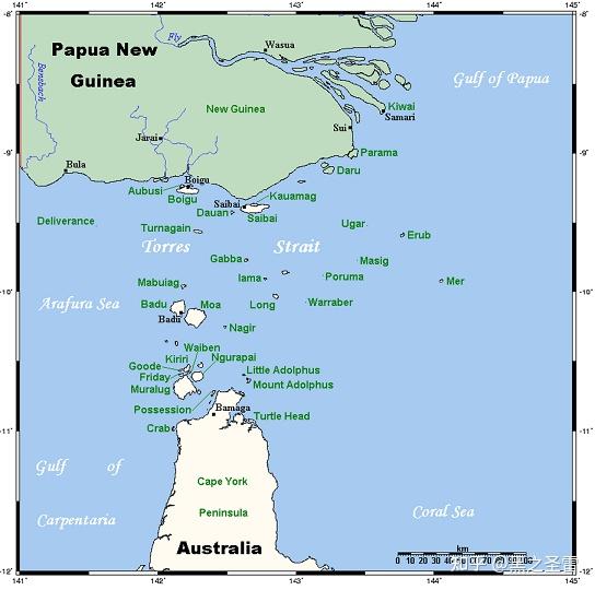 不过,在 托雷斯海峡 上有两个需要注意的地方。其一,这里位于澳洲东北角,是和新几内亚岛最靠近的地方( 事实上曾经就是连在一起的,见下文 ),所以在托雷斯海峡群岛的三种语言里,梅里亚姆语(Meriam)属于巴布亚诸语范畴下的跨东弗莱语系(East Trans-Fly), 并不属于澳洲诸语 ;而卡劳拉高亚语(Kalaw Lagaw Ya)则是属于澳洲最大的帕马-牛雅语系/PN语系;另外还有一种永普拉托克语(Yumplatok),是一种基于英语的克里奥尔语/混合语。——总之,在这三者之中,只有卡劳拉高亚语属于澳洲诸语范畴下。