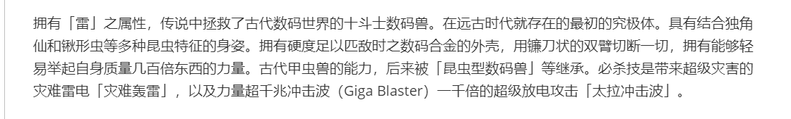 ps:又一boss潜力股,登场于dxc却未x进化,希望这些图鉴的故事尽快揭开吧。现在世界观如此完备成熟,数码兽个体破千,究极体300+还有丰富的组织,交织在一起可以构成一副宏大浪漫的故事吧。