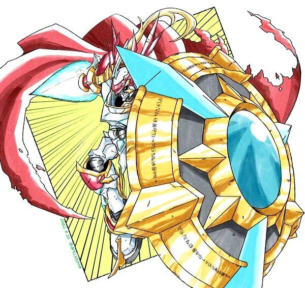 全身覆盖以强大防御力著称的「红色数码合金」之铠,即使究极体也不能轻易造成伤害。六足具备优秀机动力,很难想像这样的大块头可以进行瞬间高速移动。负责保护沉睡在数码世界北极厚冰下的超古代遗迹,据说这个遗迹封印着与数码兽的创生相关的重要线索。必杀技是左手圣弩「穆斯贝尔海姆」射出的灼热光矢「虹桥烈矢],右手圣盾「尼福尔海姆」操纵气候引发极低温暴风雪的「奥丁寒息」 ,只有究极v龙兽能够躲开得以幸存