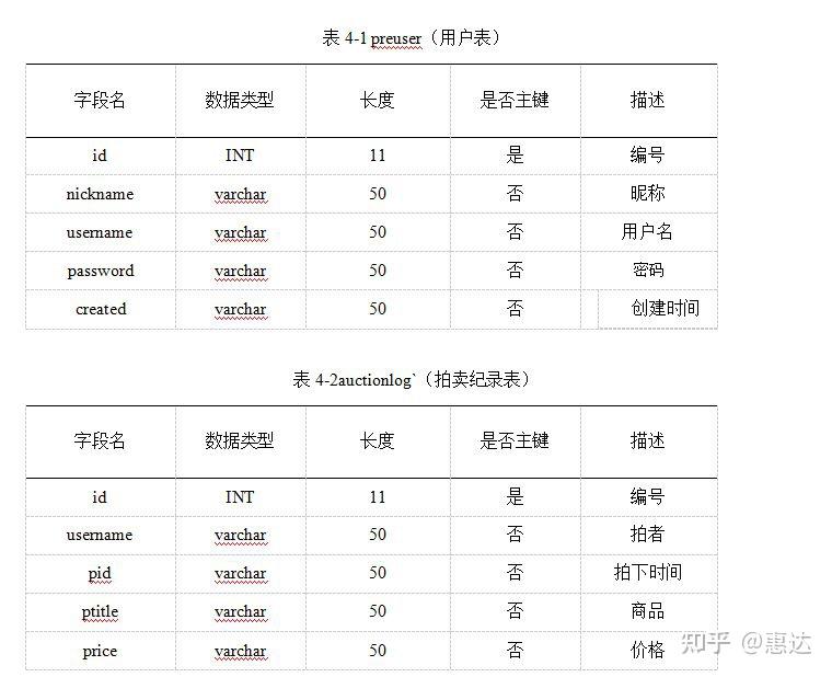 根据系统功能设计的要求和功能模块的划分,拍卖网站设计与实现一共涉及到多个数据表。下面就介绍一下各别主要数据库表的设计结构及其功能建立数据库表: