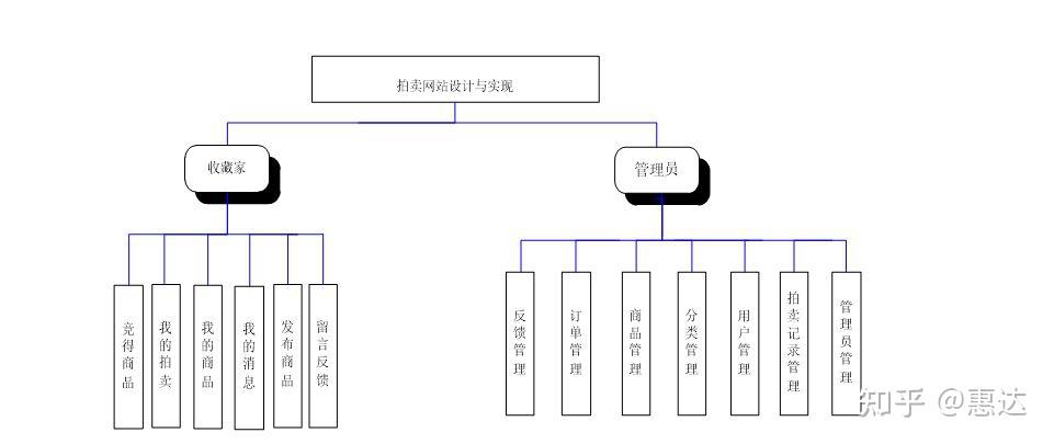 通过系统需求分析,本拍卖网站设计与实现主要包括管理员:反馈管理、订单管理、商品管理、分类管理、用户管理、拍卖记录管理、管理员管理,收藏家:竞得商品、我的拍卖、我的商品、我的消息、发布商品、留言反馈等功能。其功能结构图如下图4-1所示:
