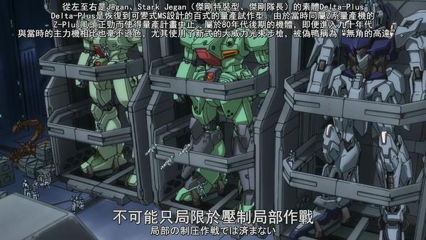 铃铛队的机师实力不错,里谢尔也是相当不错的量产机,但拟-阿卡玛很不幸的在工业7号遇到了刹帝利(大青椒)。虽然大青椒被独角兽击退,但这场战斗还是让拟-阿卡玛的部队损失惨重;雪上加霜的是,他们随后又遭遇了弗尔-伏朗托驾驶的新安洲。为了夺回独角兽,铃铛队补充了不少机体,甚至一度增加了德尔塔高达(即恢复变形机能的百式,不过最终停留在设计图纸上)的量产型,德尔塔+;