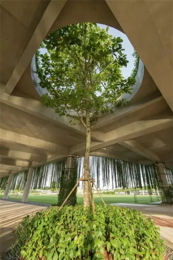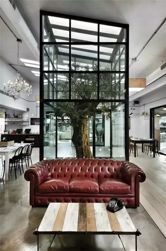 看得出是原来就有大树,经过改装,用玻璃幕墙把大树包围,