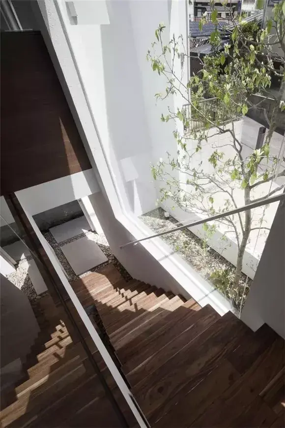 利用别墅楼梯走廊的逼仄地带,种一些高树绿植,很有情趣