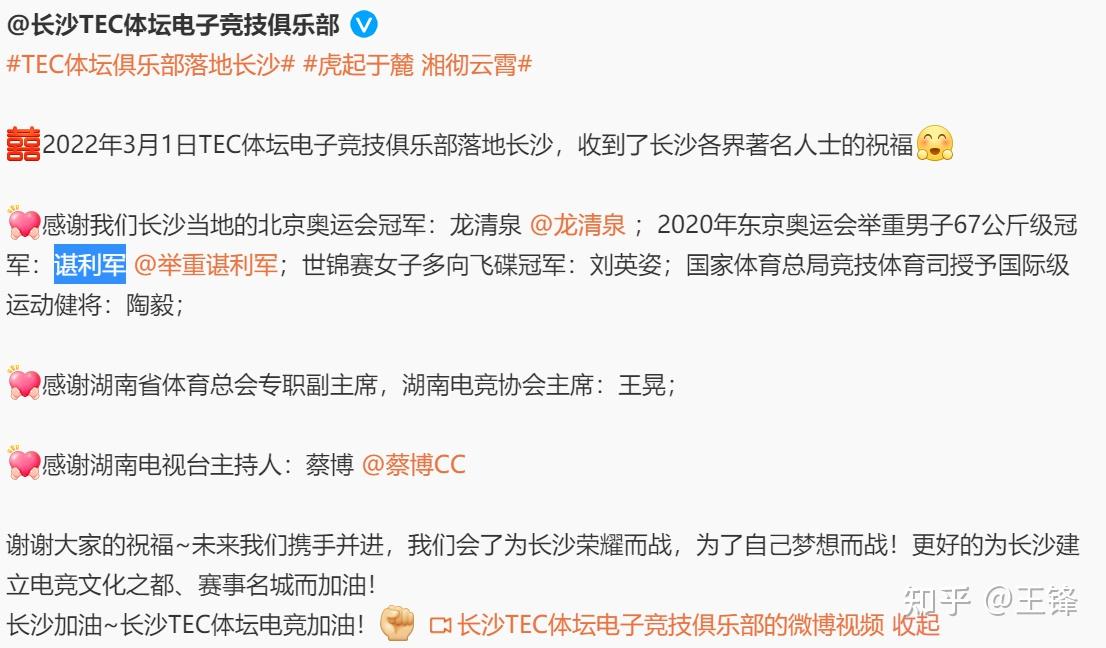 TEC体坛电子竞技俱乐部落地长沙,更是收到了当地各界著名人士的的祝福,比如08奥运会举重冠军龙清泉,20奥运冠军谌利军等等