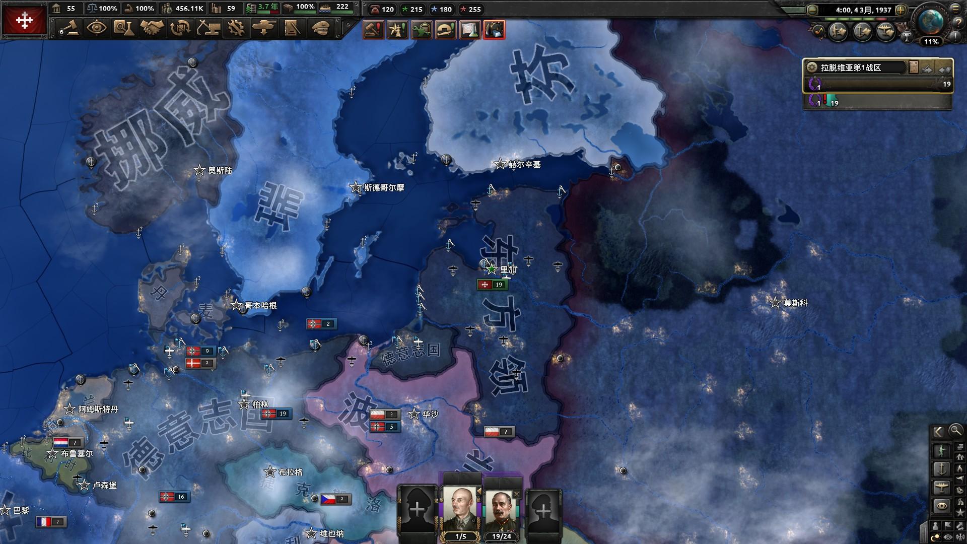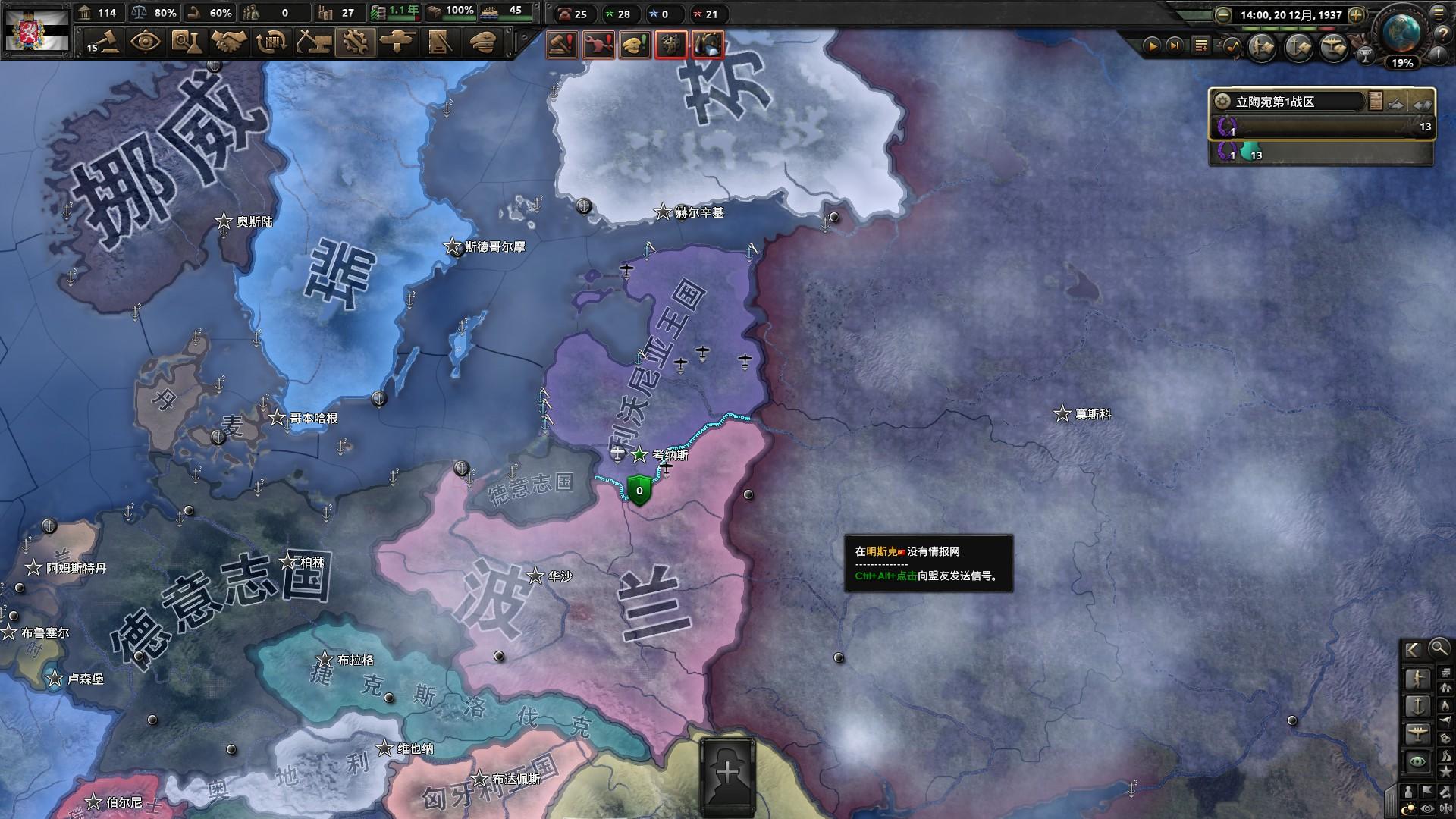 红线:波罗的海三国的红线都有一个通过策动白俄罗斯起义,从而吞并白俄罗斯的国策。可获得整个白俄罗斯的核心。