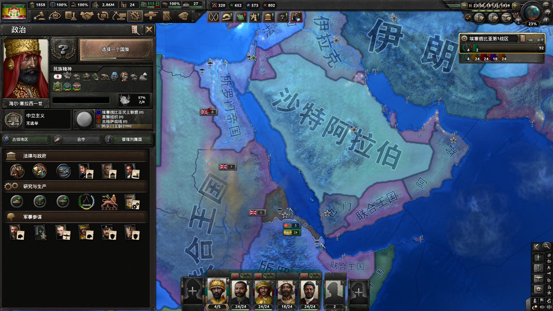 埃塞的红线点到底(皇帝线也有一个分支应该也能成立)。通过煽动殖民地独立,把非洲各国拉进理事会,可以将其整合成傀儡国并获得其核心。理论上可以获得整个非洲的核心,但是PP花费巨大,正常玩估计得攒到21世纪。