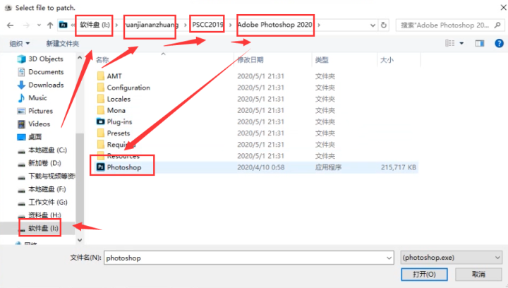 5、点击胶囊之后就是要找到软件的根目录,跟着我们之前在软件安装的时候设置的路径(第8步),找到我们的软件的根目录,软件选择【photoshop】应用程序,最后点击打开