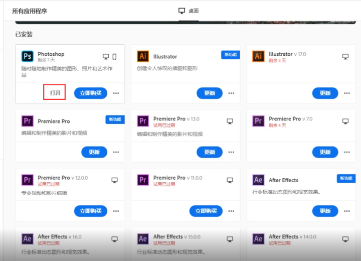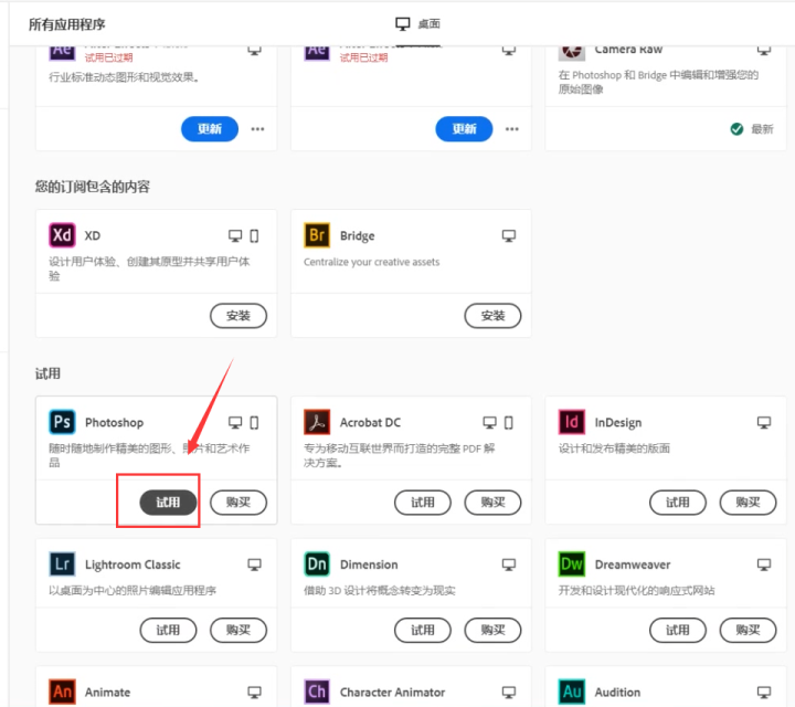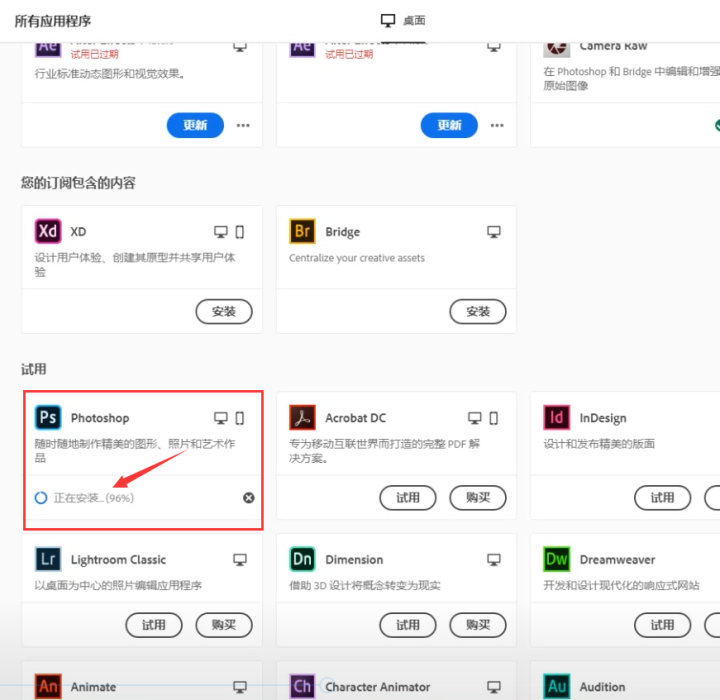 9、设置完上面的内容之后,找到PS,点击试用,软件会自动进行PS软件安装