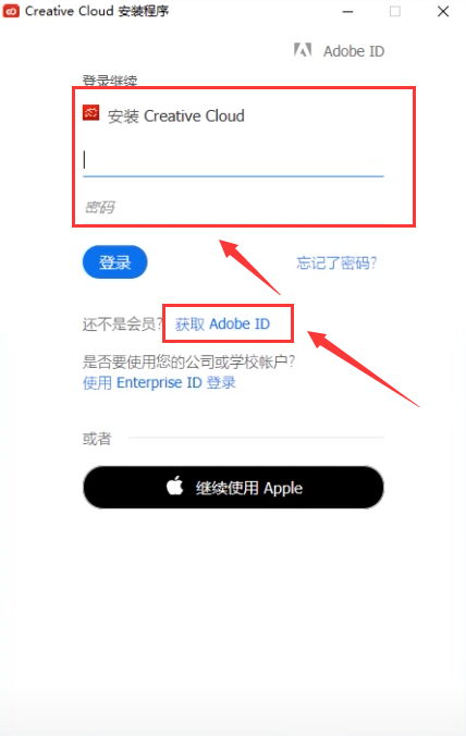 5、打开软件之后弹出注册登录界面,没有Adobe ID的朋友点击“获取Adobe ID”,填写相关注册信息,并点击“注册”注册完成后点击“继续”