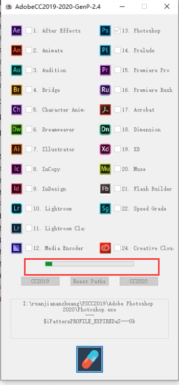 4、打开注册机之后,选择要破解的软件PS,进行勾选,然后选择下面的胶囊