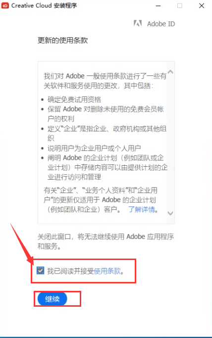 6、勾选同意条款,点击继续
