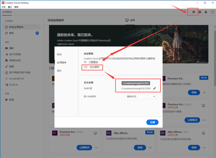 8、安装好Adobe云盘软件后,打开软件进行设置,关掉常规设置里的按钮,然后选择应用程序,关闭自动更新,然后更改软件安装位置,除C盘以为的其他盘都可以安装,安装位置都必须是英文的