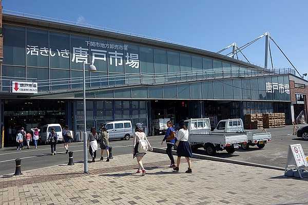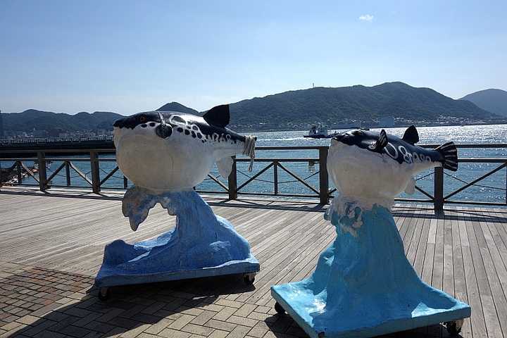 如今的山口县下关被称为“河豚之本场”,意为河豚的原产地、正宗产地。下关渡轮码头旁边就是一整片的河豚餐馆和的河豚吉祥物。唐户市场也在这里。