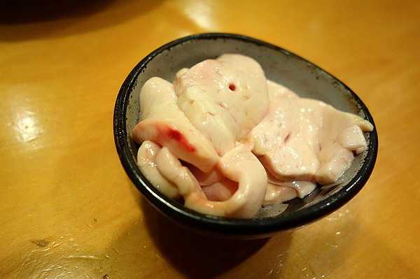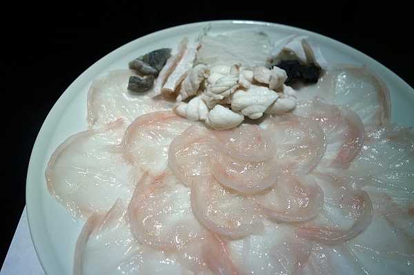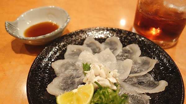 和店里的小哥聊得投缘,小哥端上来一盘形似内脏的东西,豪爽地说:河豚肝,送你吃的。我也没多虑,当下便夹起来生吃了一片。牙齿才刚将它咬开,肝脏的油脂香味就迅速地充盈了整个口腔。小哥说,这肝脏用来涮火锅也行。我试了试,但还是觉得生吃河豚肝的美味更让人难忘。