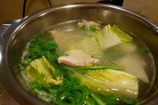 到了河豚火锅的环节。唔,这股鲜味儿是怎么回事。连煮过河豚肉的汤都带着鲜味,一起下锅的蔬菜和粉也变得更好吃了。