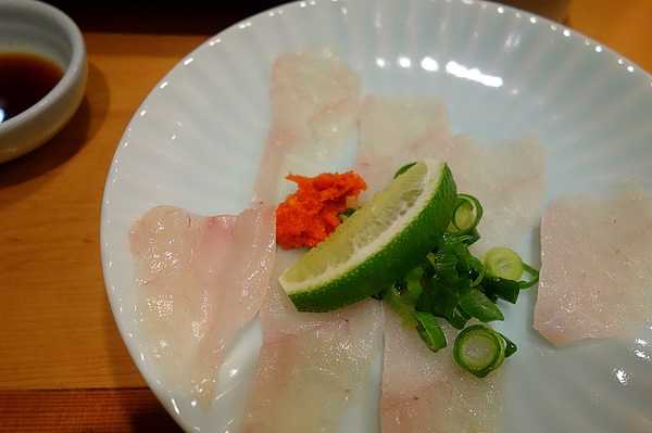 河豚刺身。野生河豚和其他河豚有什么区别?光从刺身的颜色上就能看出来。博多い津み的女将告诉我,上好的野生河豚刺身会带着特有的粉红色;如果是用野生河豚的鱼苗人工蓄养长大的河豚,刺身会呈象牙色;而我们常见的人工养殖的河豚,刺身会显偏灰色。我起初以为呈粉红色是由于残留着河豚血,一问,女将连忙摆手说这太危险,店里厨师会反复清洗,去除河豚血的毒素,以确保食客的安全。