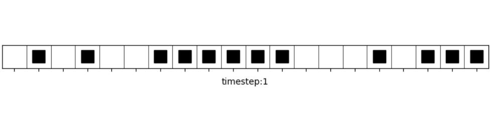 - 绘制当前时间步车辆位置的图像,注意这里有缩进,说明上一段NaSch模型演化代码中的for循环还没有结束呦~