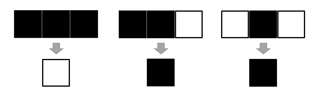 - 演化规则: 根据元胞及其邻居元胞的状态,决定下一时刻该元胞状态的动力学函数,也可以是状态转移方程。