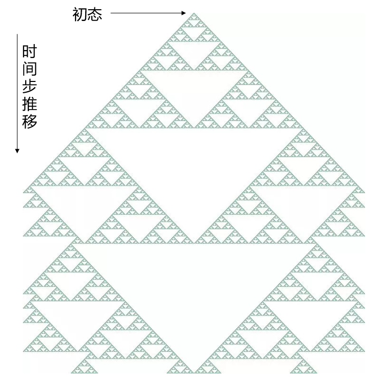 - 举个简单的例子,这是包含800个时间步的90号规则演化图案。虽然初始状态仅仅是一个点,但是随着时间的推移,简单的演化规则使图案分形,并在空间上形成了嵌套的三角形状。