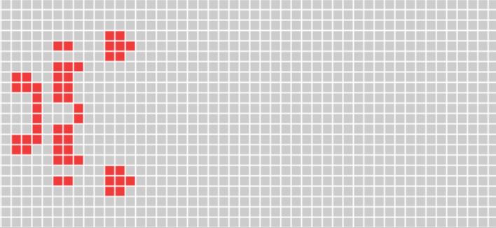 在二维平面上的方格细胞里,每个细胞有两种状态:死或活,而下一回合的状态完全受它周围8个细胞的状态而定。按照以下三条规则进行演化:
