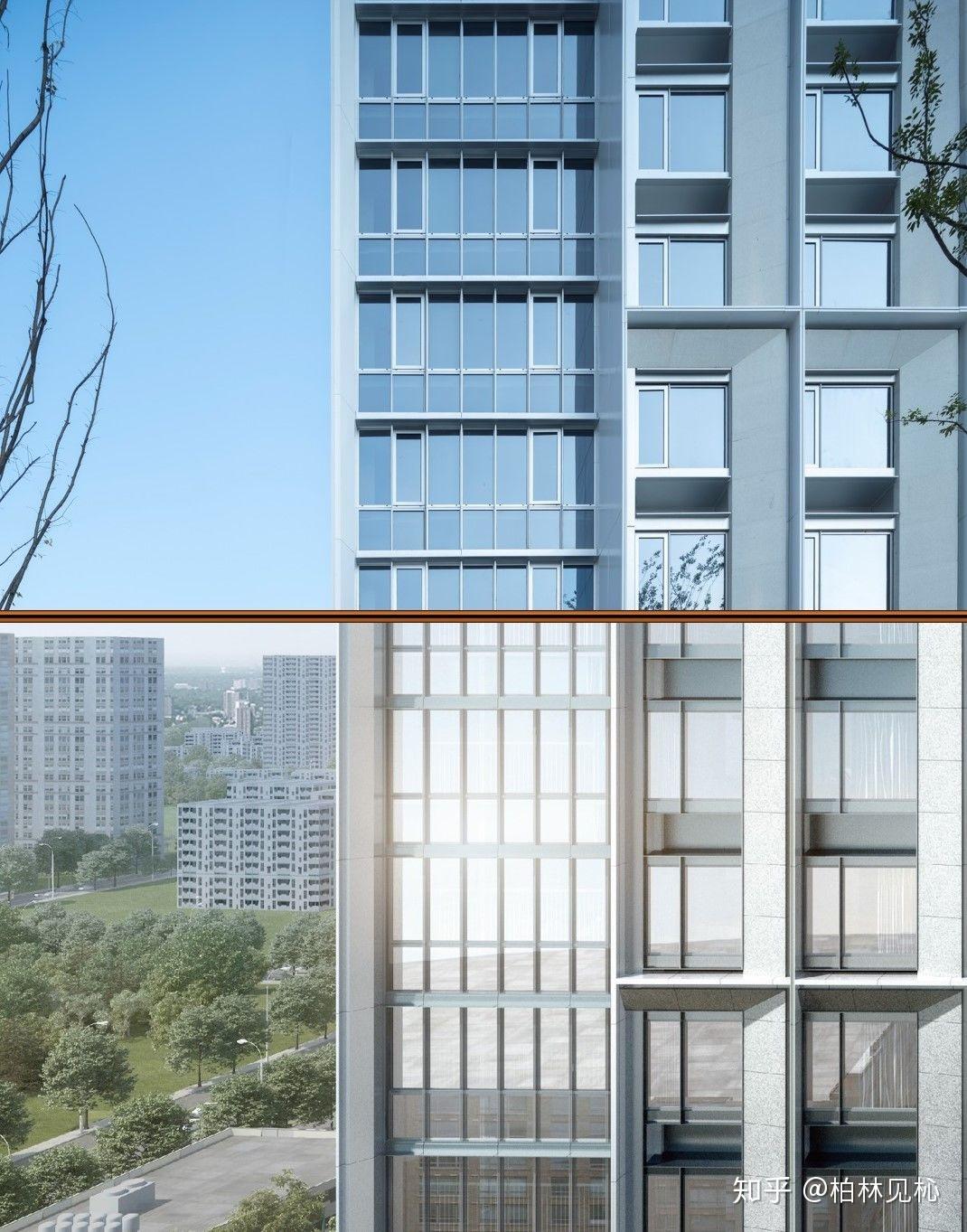 除了开窗部位(效果图省略了开窗部位), 实景图远远美过效果图。 为什么?效果图做得再好,它的质感与光影,终究还是假的。你可以再感受一下:实景图上玻璃的光泽,与铝板的质感。