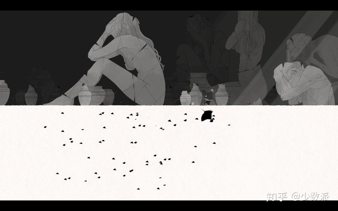 抛却一切对白和文字,《Gris》没有具体的故事要直接诉说。创作者只是用路途中掩面哭泣、情绪低沉的女性雕像,暗示小姑娘曾遭受过创伤。由于生活中痛苦的经历,《Gris》迷失于自己的世界里,身处黑白,追逐色彩,是主人公进行自我疗愈的隐喻。