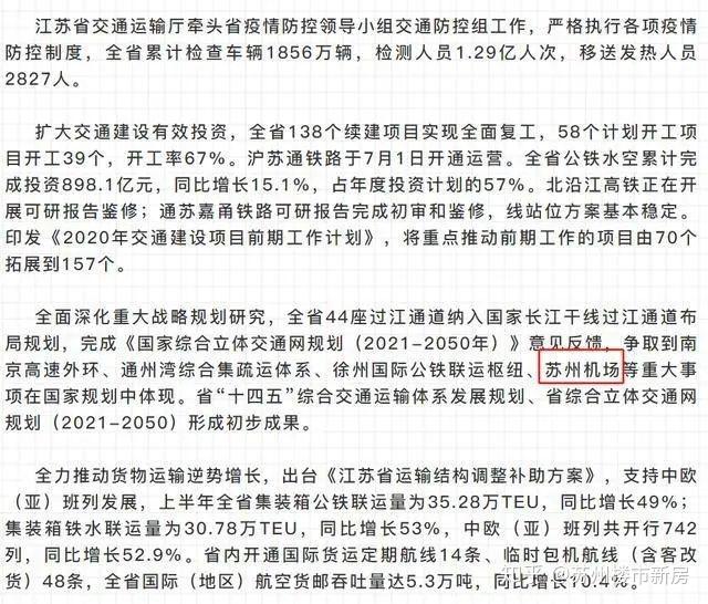 而这一进展,也早有伏笔。在今年的 7月15日 ,江苏省政府在南京召开交通运输半年工作座谈会。 会上再次提到了苏州机场。 今年上半年,全省交通运输发展有5个亮点——其中重点是苏州机场!!完成《国家综合立体交通网规划(2021-2050年)》意见反馈, 并且争取到了苏州机场等重大事项在国家规划中体现!